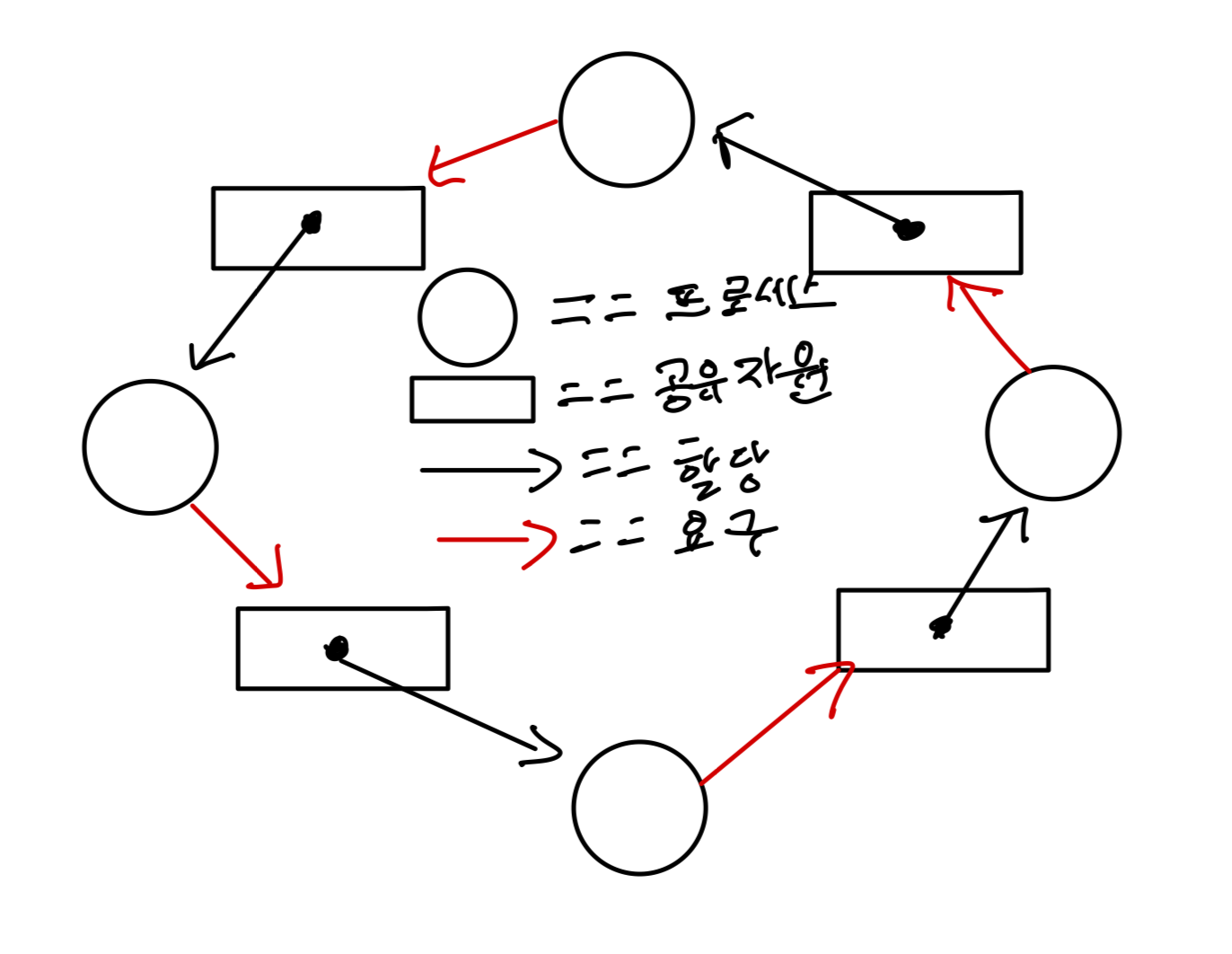 - 프로세스들이 원의 형태로 자원을 대기하는 형태