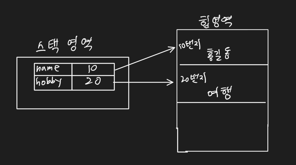 위와 같이 선언하면 메모리의 스택 영역에는 변수명과 해당 객체의 번지가 저장되고, 힙영역에 실제 객체가 생성된다.