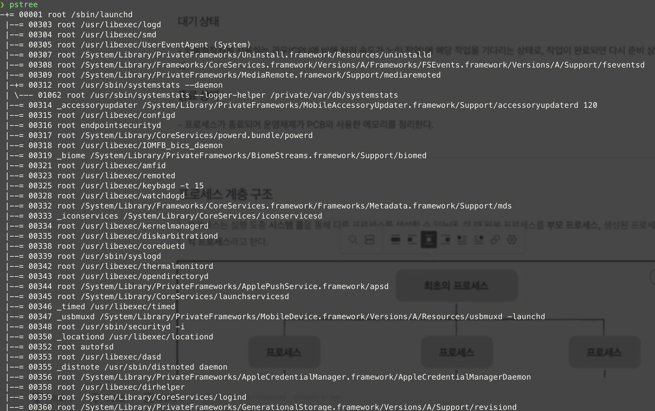 터미널에서 pstree 명령어를 사용하면 현재 실행중인 프로세스들의 계층 구조를 확인할 수 있다.