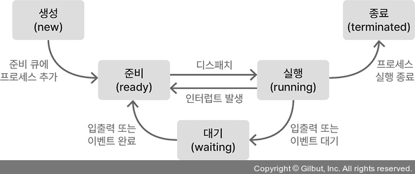 생성, 준비, 실행, 대기, 종료 상태로 나뉜다.