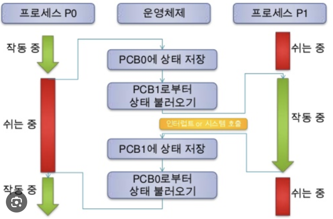 기존 프로세스의 문맥을 PCB에 백업하고, 새로운 프로세스를 실행하기 위해 문맥을 PCB로 부터 복구해 새로운 프로세스를 실행하는 것